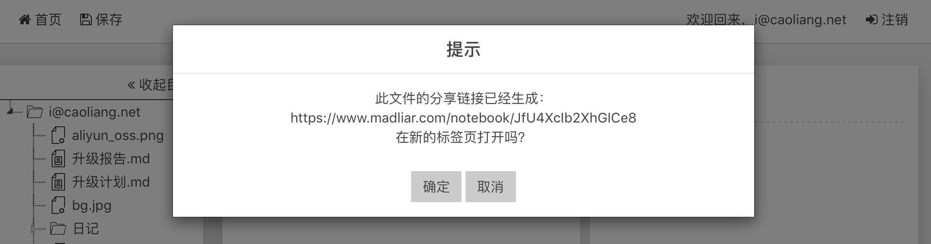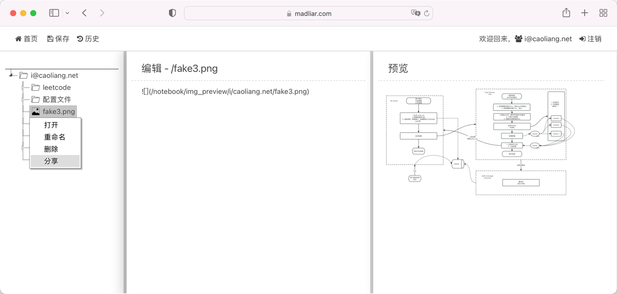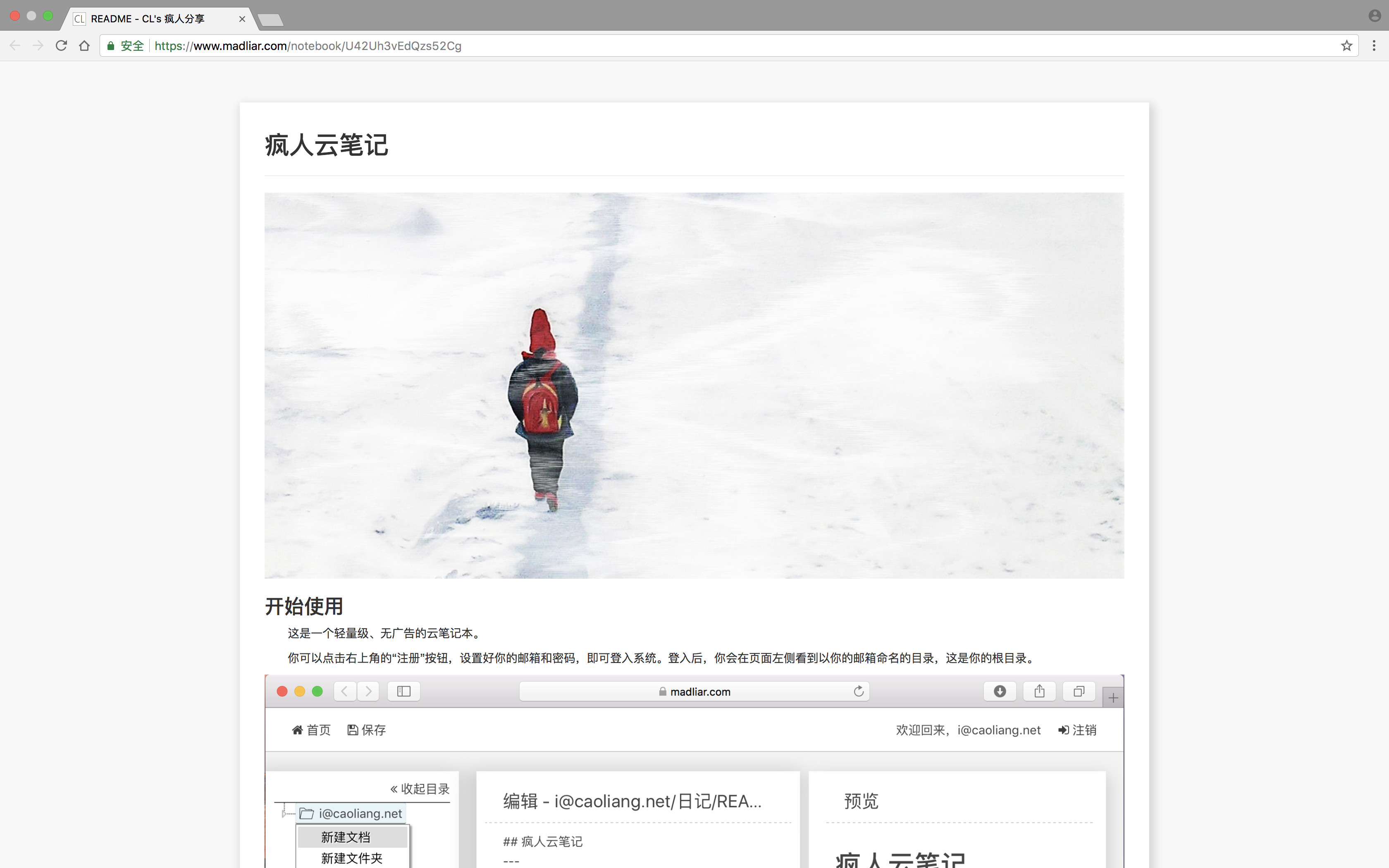 ## 疯人云笔记 ---  ### 开始使用 这是一个轻量级、支持分享、无广告的云笔记本。 你可以点击右上角的“注册”按钮,设置好你的邮箱和密码,即可登入系统。登入后,你会在页面左侧看到以你的邮箱命名的目录,这是你的根目录。   你可以在你的根目录夹下创建目录、新建文档。这个编辑器是支持markdown语法的,当然也兼容html语法。如果你不知道如何使用markdown语法撰写文档,百度上有诸多优秀的教程,你可以搜索并尝试一下。你可以为你撰写的文档创建一个分享的链接,下图就是这个这个文档分享后的效果。  你也可以上传你自己的图片、音乐或其他二进制文件。所有的二进制文件均不支持在线预览,但系统可以为这些二进制文件创建一个链接(在左侧目录树结构的文件名上右击,然后点击“分享”),这样一来,你可以把它们的链接嵌入到你自己的文档中,让它绘声绘色,就像本示例一样。   ### 安全和隐私 网站的维护者会尽可能的保护你的隐私,但你的资料依然有可能会被其他人查阅,甚至泄露到互联网。你的信息安全在这里并没有充足的保障,所以,请不要在这里上传敏感信息。 ### 最后 有任何的建议,欢迎发送邮件反馈。反馈邮箱:i#caoliang.net。 ---