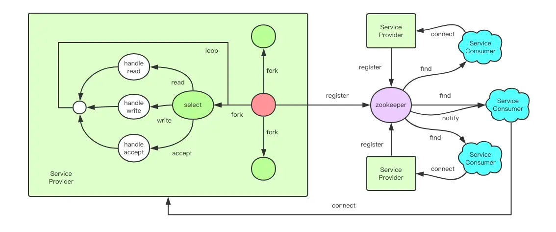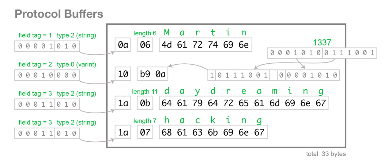 ## 使用RPC构建高并发web应用 > 声明:部分插图来源于互联网 #### 目录: 1. RPC概述 2. Redis文本协议 3. Protobuf协议 4. gRPC实践 ### 1. 什么是 RPC ? RPC (Remote Procedure Call)即远程过程调用。除 RPC 之外,常见的多系统数据交互方案还有分布式消息队列、HTTP 请求调用、数据库和分布式缓存等。 RPC 是两个子系统之间进行的直接消息交互,它使用操作系统提供的套接字来作为消息的载体,以特定的消息格式来定义消息内容和边界。  现代企业的关键性 RPC 服务是绝不可以只使用单点部署的。对 RPC 服务进行分布式化,使得服务可以容忍个别节点故障仍能继续对外提供服务。  #### * 容灾 Failover与降权 比如当节点挂掉时,将失效节点摘除,放置到失效节点列表中。然后每隔一段时间检查失效节点是否恢复了,如果恢复了,那就从失效节点中移除,再将节点地址重新加入到有效节点列表中: 1. 常用时间窗口降权法,统计在一定时间窗口里出现的错误数量,过大则降权 2. 不降到零,那是为了给节点提供一个恢复的机会。 3. 被降权的节点后来只要有一次调用成功,那么 weight 值就应该尽快被还原 一个简单的策略是权重减半法。错误一次权重减半,连续错误两次权重就降到 1/4,如此直到降到最小值。如果初始权重值是 1024,那么权重值就会逐渐衰减```1024=>512=>256=>128=>64=>32=>16=>8=>4=>2=>1```。 如果节点恢复了,那么调用会成功,权重就可以直接恢复到正常值,也可以通过加倍法逐渐恢复到正常值```1=>2=>4=>8=>16=>32=>64=>128=>256=>512=>1024```。 如果希望恢复的更快一点,可以通过乘 4 法,乘 8 法。 #### * 服务发现 健壮的服务应该是可以支持动态扩容的服务。当 RPC 服务节点增加或减少时,客户端可以动态快速收到服务列表的变更信息,从而可以实时调整连接配置,这样无需重启就可以完成服务的扩容和缩容。  服务发现技术依赖于服务之间的特殊中间节点。这个节点的作用就是接受服务的注册,提供服务的查找,以及服务列表变更的实时通知功能。它一般使用支持高可用的分布式配置数据库作为解决方案,如 zookeeper/etcd 等。 - 服务注册——服务节点在启动时将自己的服务地址注册到中间节点 - 服务查找——客户端启动时去中间节点查询服务地址列表 - 服务变更通知——客户端在中间节点上订阅依赖服务列表的变更事件。当依赖的服务列表变更时,中间节点负责将变更信息实时通知给客户端。  ### 2. Redis文本协议 RESP (Redis Serialization Protocol) 对于一串消息流,我们必须能确定消息边界,提取出单条消息的字节流片段,然后对这个片段按照一定的规则进行反序列化来生成相应的消息对象。  RESP 是 Redis 序列化协议的简写。它是一种直观的文本协议,优势在于实现异常简单,解析性能极好。 Redis 协议将传输的结构数据分为 5 种最小单元类型,单元结束时统一加上回车换行符号\r\n。 1. 单行字符串 以+符号开头; 2. 多行字符串 以$符号开头,后跟字符串长度; 3. 整数值 以:符号开头,后跟整数的字符串形式; 4. 错误消息 以-符号开头; 5. 数组 以*号开头,后跟数组的长度; 单行字符串 hello world ``` +hello world\r\n ``` 直观打印如下: ``` +hello world ``` 多行字符串 第一行是长度,剩下的是内容,表示字符串 hello world 如下: ``` $11\r\nhello world\r\n ``` 直观打印如下: ``` $11 hello world ``` 多行字符串当然也可以表示单行字符串。 整数 冒号开头 表示整数 1024 如下: ``` :1024\r\n ``` 直观打印如下: ``` :1024 ``` 错误 减号开头后跟错误名称和详细错误解释 表示「参数类型错误」如下: ``` -WRONGTYPE Operation against a key holding the wrong kind of value\r\n ``` 直观打印如下: ``` -WRONGTYPE Operation against a key holding the wrong kind of value ``` 数组 第一行是长度,后面依次是每个内容,表示数组 [1,2,3] 如下: ``` *3\r\n:1\r\n:2\r\n:3\r\n ``` 直观打印如下: ``` *3 :1 :2 :3 ``` 数组里面可以嵌套其它类型,甚至可以嵌套另外一个数组,如此就可以形成复杂的数据结构。 NULL 用多行字符串表示,不过长度要写成-1。 ``` $-1\r\n ``` 直观打印如下: ``` $-1 ``` 空串 用多行字符串表示,长度填 0。 ``` $0\r\n\r\n ``` 直观打印如下: ``` $0 ``` 注意这里有两个\r\n,为什么是两个,因为两个\r\n 之间隔的是空串。 #### 发送指令:客户端 -> 服务器 客户端向服务器发送的指令只有一种格式,多行字符串数组。比如一个简单的 set 指令set author codehole会被序列化成下面的字符串。 ``` *3\r\n$3\r\nset\r\n$6\r\nauthor\r\n$8\r\ncodehole\r\n ``` 在控制台输出这个字符串如下,可以看出这是很好阅读的一种格式。 ``` *3 $3 set $6 author $8 codehole ``` #### 发送指令:服务器 -> 客户端 服务器向客户端回复的响应要支持多种数据结构,所以消息响应在结构上要复杂不少。不过再复杂的响应消息也是以上 5 中基本类型的组合。 数组响应 ``` 127.0.0.1:6379> hgetall info 1) "name" 2) "laoqian" 3) "age" 4) "30" 5) "sex" 6) "male" ``` 这里的 hgetall 命令返回的就是一个数值,第 0|2|4 位置的字符串是 hash 表的 key,第 1|3|5 位置的字符串是 value,客户端负责将数组组装成字典再返回。 ``` *6 $4 name $6 laoqian $3 age $2 30 $3 sex $4 male ``` 嵌套 ``` 127.0.0.1:6379> scan 0 1) "0" 2) 1) "info" 2) "books" 3) "author" ``` scan 命令用来扫描服务器包含的所有 key 列表,它是以游标的形式获取,一次只获取一部分。 scan 命令返回的是一个嵌套数组。数组的第一个值表示游标的值,如果这个值为零,说明已经遍历完毕。